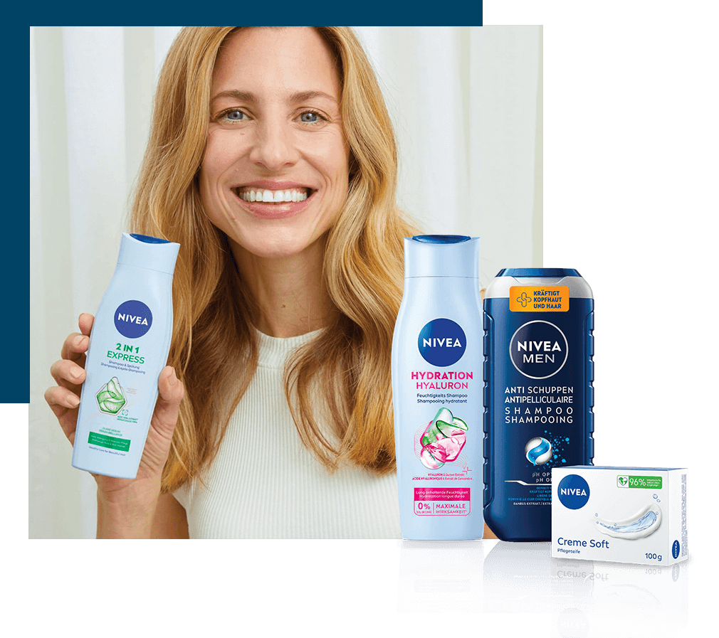 Una linea esclusiva per la cura dei capelli Nivea, con una formula unica arricchita con ingredienti naturali ad alte prestazioni, per capelli visibilmente più sani e più belli. Efficace ma delicata su cute e capelli. Un trattamento completo per ogni esigenza, con una formula priva di siliconi, senza microplastiche, vegana e biodegradabile al 99%. I saponi solidi “Creme Care” e “Creme Soft”, con la caratteristica fragranza del marchio, detergono delicatamente, nutrono e si prendono cura delle mani, lasciandole perfettamente pulite e piacevolmente vellutate grazie a una formula semplice ma efficace che contiene Eucerit®.